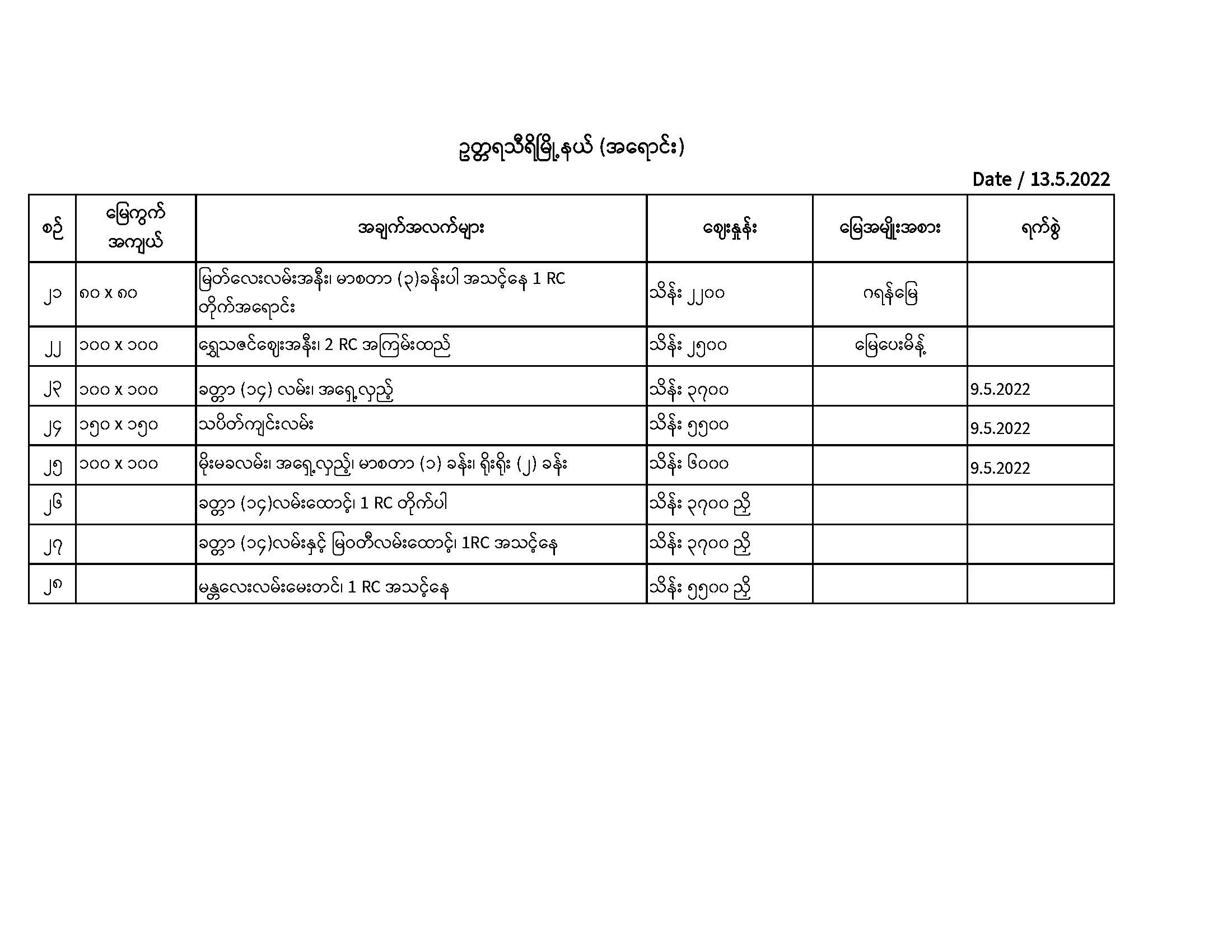 ၆။သစ်ခွလမ်း(၁၂၄/၉၀/၈၀/၈၀)မြေပိုပါ မြေကွတ်(၁၃၅၀) - ဆက်သွယ်ရန် ပ-၁၉၆ ပြေကုန်းပွဲရုံတန်း ကျောက်မျက်အနီး နေပြည်တော်။