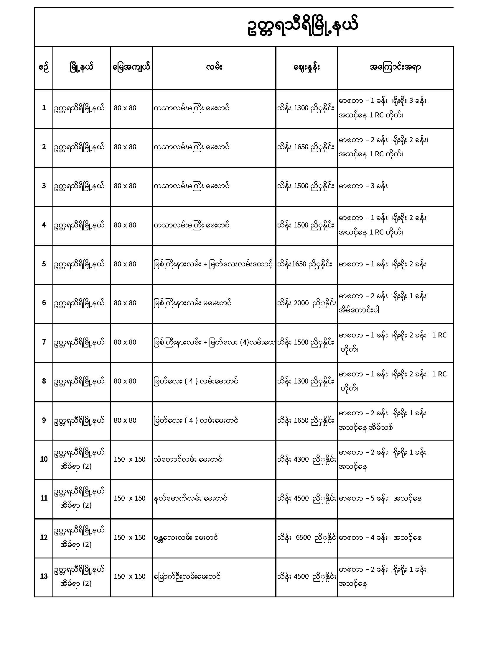• အျခား ေနျပည္ေတာ္ ၿမိဳ႕နယ္စံုရွိ အိမ္ၿခံေျမမ်ားကို ေလ့လာၾကည့္ရႈလိုလွ်င္ MKK အိမ္ၿခံေျမအက်ိဳးေဆာင္ကုမၸဏီသုိ႔ လာေရာက္ ၾကည့္ရႈႏုိင္ပါသည္။ ပိုင္ဆိုင္မႈခုိင္မာေစရန္ ႏွင့္ ေစ်းႏႈန္းမွန္ကန္ေစရန္ တာ၀န္ယူပါသည္။